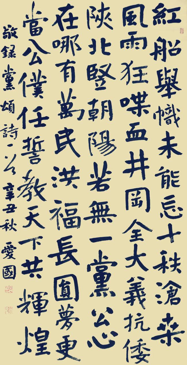 宝剑锋从磨砺出,梅花香自苦寒来。几十年的艰苦探索,使爱国具备了较为深厚的书法艺术修为,楷书、行草书均臻上乘。看他的作品,第一印象就是功力深厚,气象正大,可以说颜鲁公书法的精神气质在他笔下得到了完美的体现。一般人写颜楷容易写得死板僵硬,且易产生笔画雷同的习气,但爱国的楷书在保持颜楷厚重大气朴拙的同时又不失灵动与多变。这与他取法广泛、博涉多优是分不开的。他在颜楷的基础上融入篆隶、魏碑、行草等多重元素,从而使他的楷书既有颜体的宽博厚重,又有魏碑的雄强、行草的活泼及篆隶的高古,已颇具个人面貌。在行草书的学习上,爱国长期沉浸于圣教序、二王手札、书谱、颜氏三稿之间,因此他的行草书主要是二王书风与颜真卿风格的有机结合,极具正大气象。