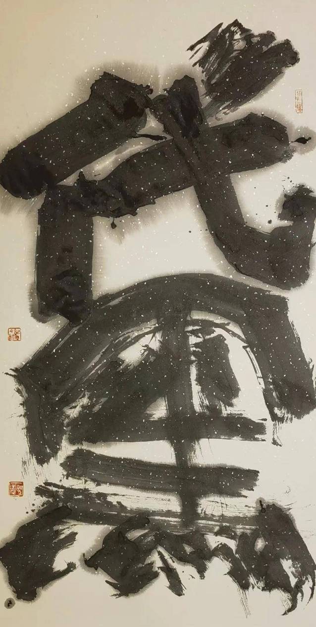 十多年前就认识纪君了,那时他的创作还是比较传统的。他的书法传统功力深厚,在我认识的书法家里边,他属于年轻一代实力派书法家,用笔用墨我非常欣赏。他从隶书、汉碑入手,打好了传统的功底,然后进行大字的墨象作品创作探索,今天看到他的这批新作,令我十分震撼,感觉耳目一新。墨象派曾在日本很流行,他们把汉字,尤其是古文字的独字、少字作品搞得很大,效果很好,称之为“墨象”。书法是线条艺术,是用粗细不同,长短不等,浓淡有别的墨线来塑造字型。所谓墨象是用墨来塑造形象,而纪君创作的作品不但讲究墨象、墨形,更主要的强调表现神,所谓形神皆备。所以我看到他这次展览主题为“墨映心象”,我觉得这是纪君先生把“墨象”升华为“心象”,是他对大字作品创作又有了更深入的理解。在书法事业发展需要大字作品、呼唤大字作品创新的背景下,他通过大字作品创作来表达他的“心象”。字如其人、书为心画,纪先生强调心象,是他心灵的呼唤,其作品表达了他的心声,展现了他的精神世界。所以,他所创造的墨象作品就是他的心象作品。
