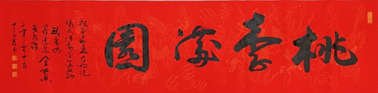 中国工艺美术大师张庆明“桃李满园”书法——张庆明暨广东省工艺美术大师罗建泉、黄超洪同贺曹加勇大师收徒
