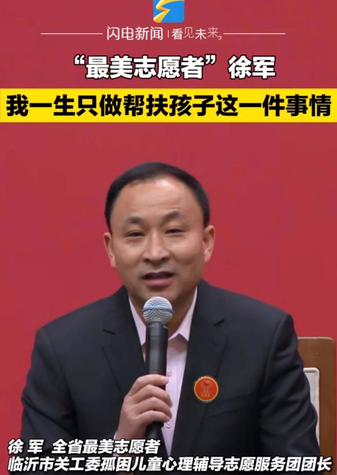 徐军,现任中华炎黄文化研究会砚文化研究分会荣誉会长、山东省临沂市手牵手孤困儿童心理辅导志愿服务团团长,参与公益事业20余年,带领8000多名志愿者帮扶5317名孤困儿童。先后荣获全国劳动模范、全国道德模范提名奖、为全面建成小康社会做贡献先进个人、全国关心下一代工作先进个人,被称为孤困儿童成长道路上的“引路人”。同时,积极支持弘扬中华砚文化公益事业,为砚文化的发展做出了重要贡献。