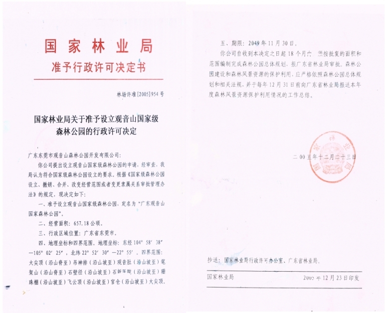 三个多月后,经广东省林业厅审核和原国家林业局验收,2005年12月23日,原国家林业局正式批准成立广东观音山国家森林公园,批文是林场许准[2005]954号。